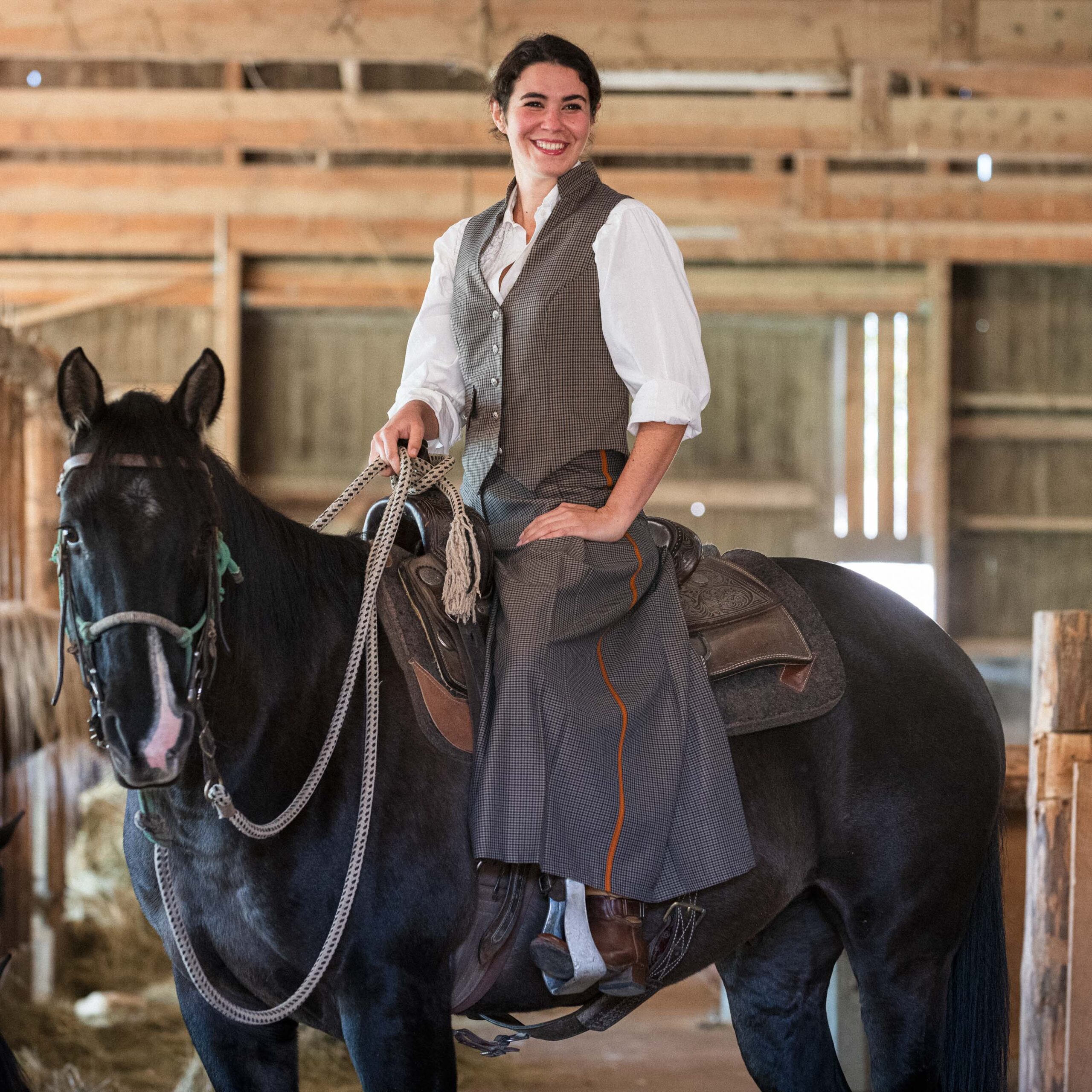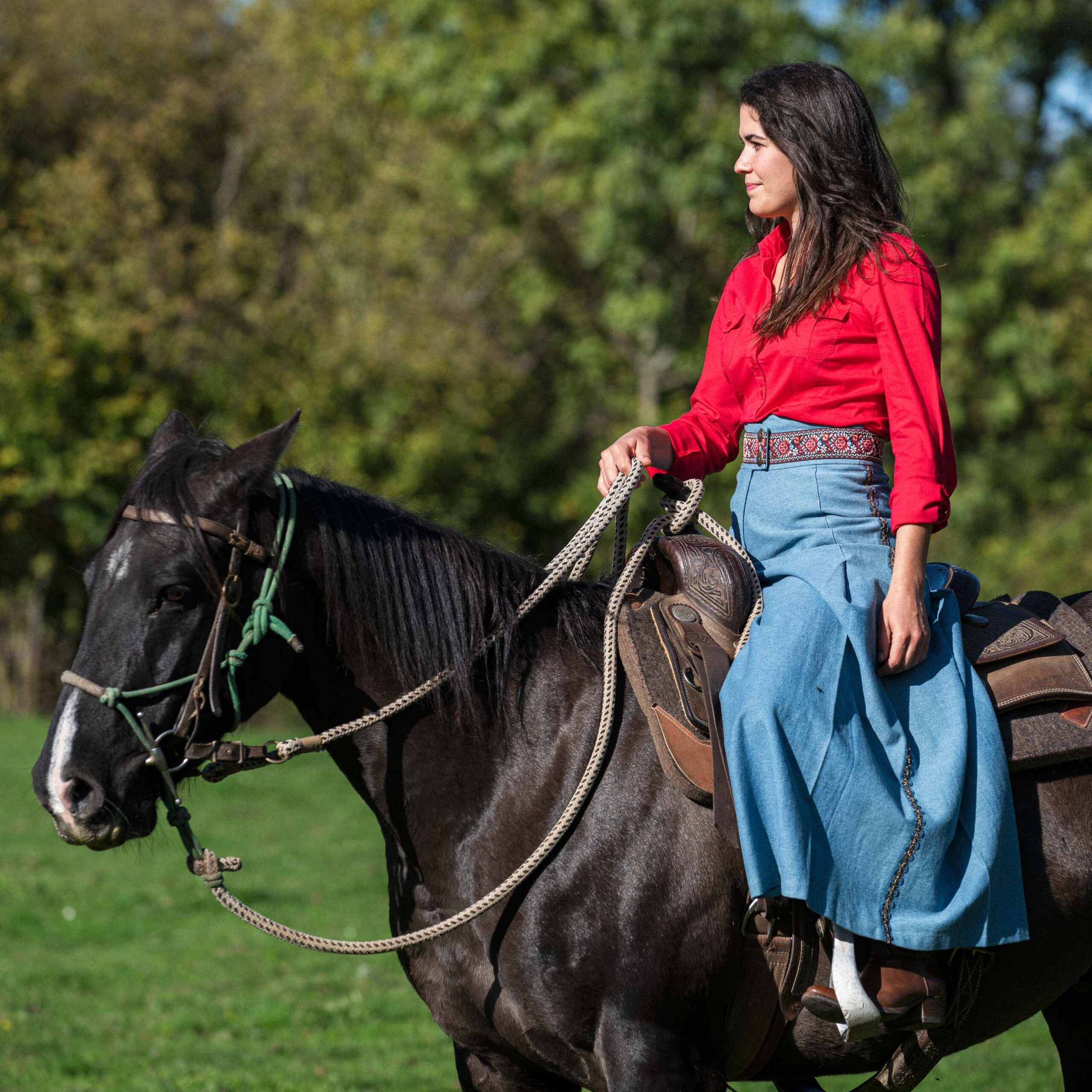 Jupes de cavalières espagnoles, jupes d’équitation, vestes et gilets pour femmes, vestons pour hommes. Heidi Shakopee, créatrice, couturière et artisan d’art, confectionne des tenues d’une rare élégance.