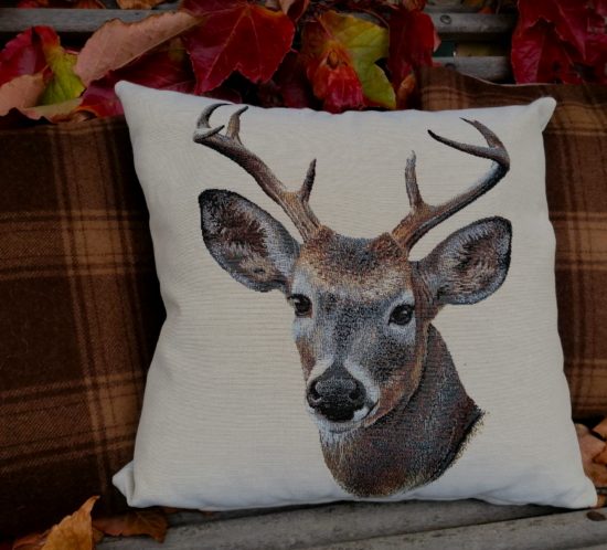 Coussin cerf sur fond crème, façon tapisserie recto – cerfs avec cors de chasse marrons sur fond crème verso – dimensions 45×45 cm – fermeture zip.
